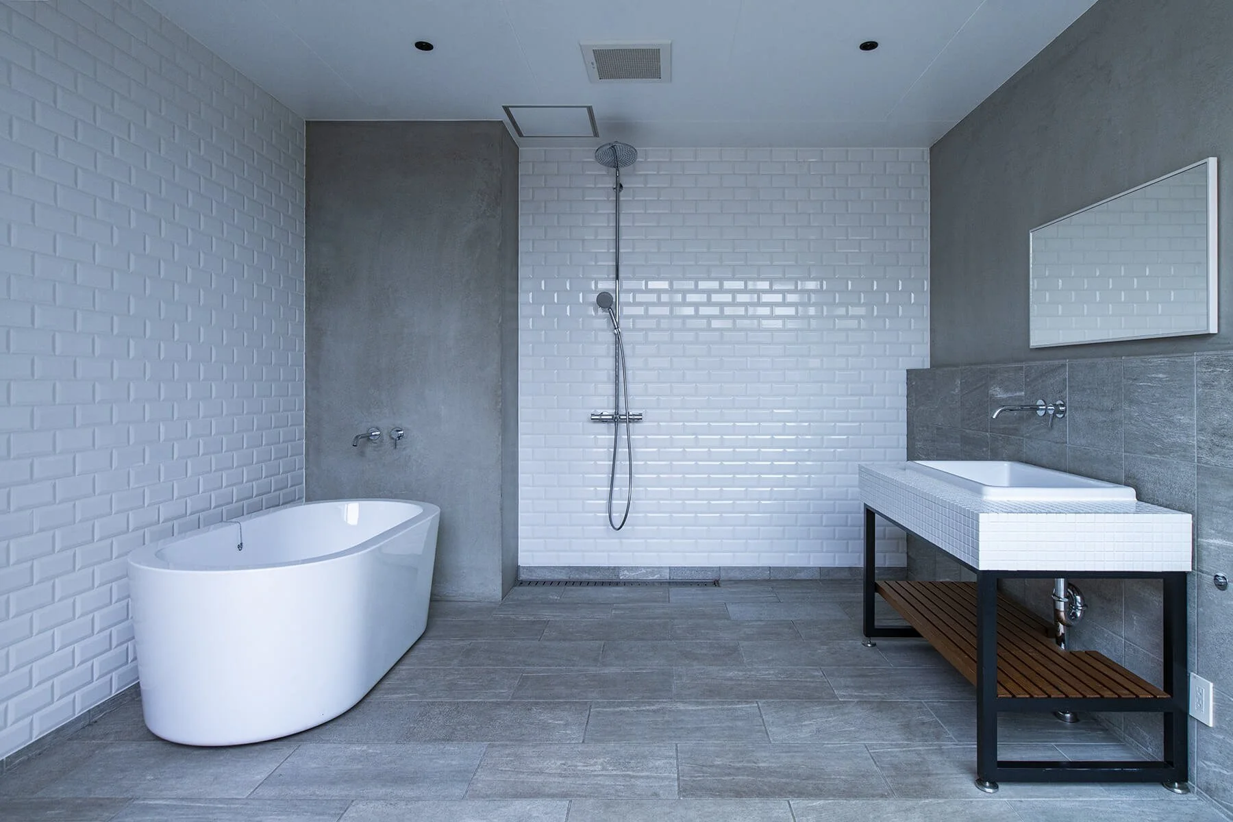 The simple tiled bathroom has plenty natural light from the large windows allowing you to shoot projects requiring water to be used.